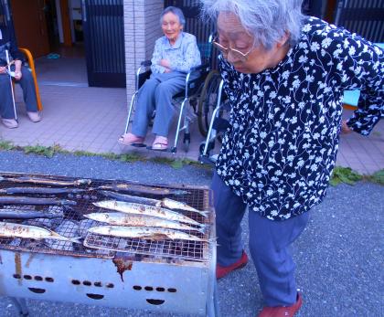 秋の味覚秋刀魚の炭火焼きを行いました。炭の匂いと秋刀魚の焼けた香ばしい匂いが食欲をそそり、「早く食べたい」と焼き上がりを心待ちにしている様子が見られました。焼きたての秋刀魚を皆様にご提供いたしました。皆様ぺろりと完食され、美味しいと笑みを浮かべていました。