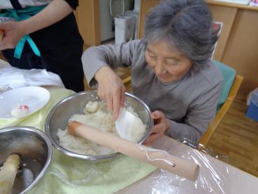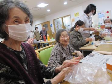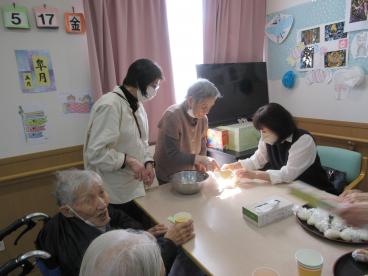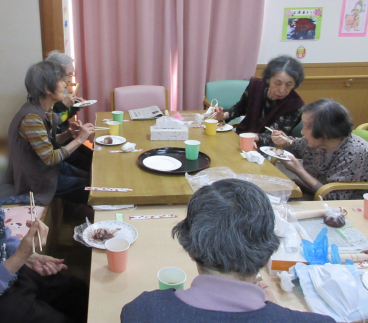 避難訓練後は、皆さん1階に集まって、おはぎ作りを行いました! もち米はのどに詰まらせると良くないので、ご飯をつぶして粘り気を出し、たっぷりのあんこで包みました。皆さん美味しそうに召し上がっていましたが、中には「うちで作るときはこんなに砂糖を入れないんだ」と言って、作り方を教えてくださる方も。スタッフも目から鱗でした!