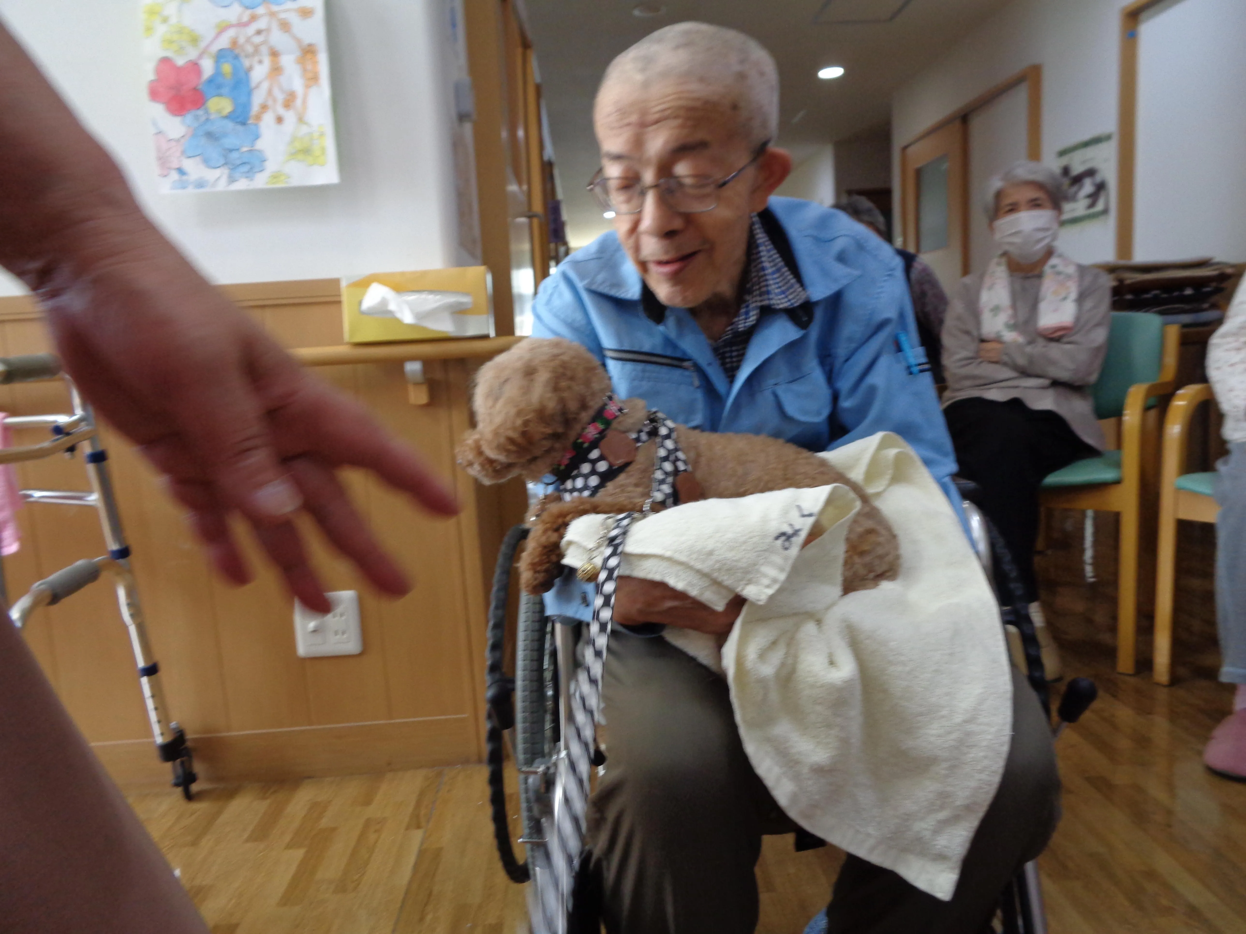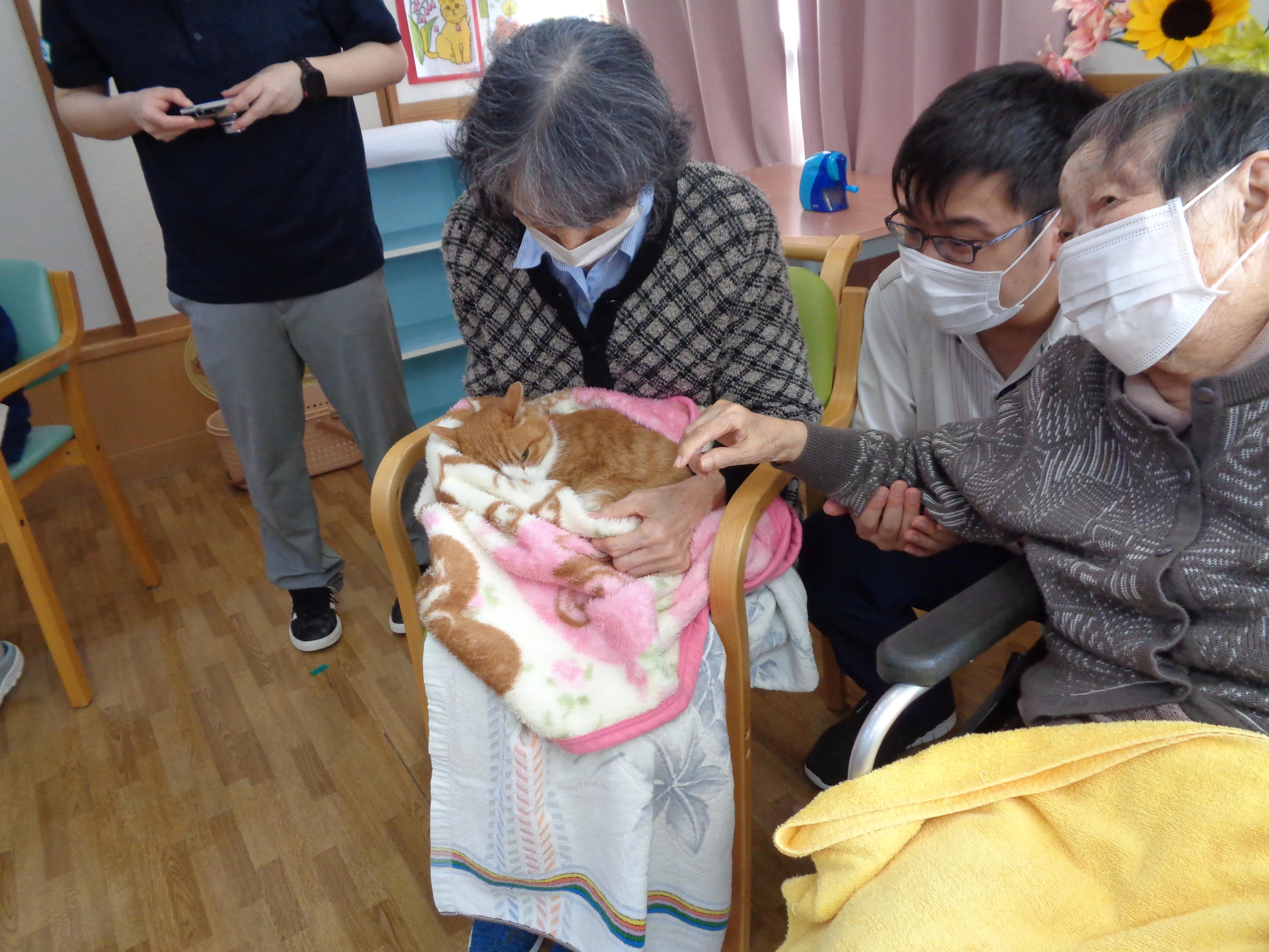 入居以来、ほとんどの方が動物とのふれあいの機会は無く、スタッフも少し心配していましたが、皆さま喜ばれ、積極的に触れに行ってくださいました。
