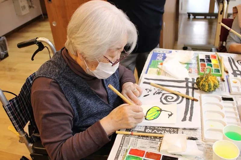 グループホームでは、サ高住で開催された絵手紙のイベントに参加してきましたよ。