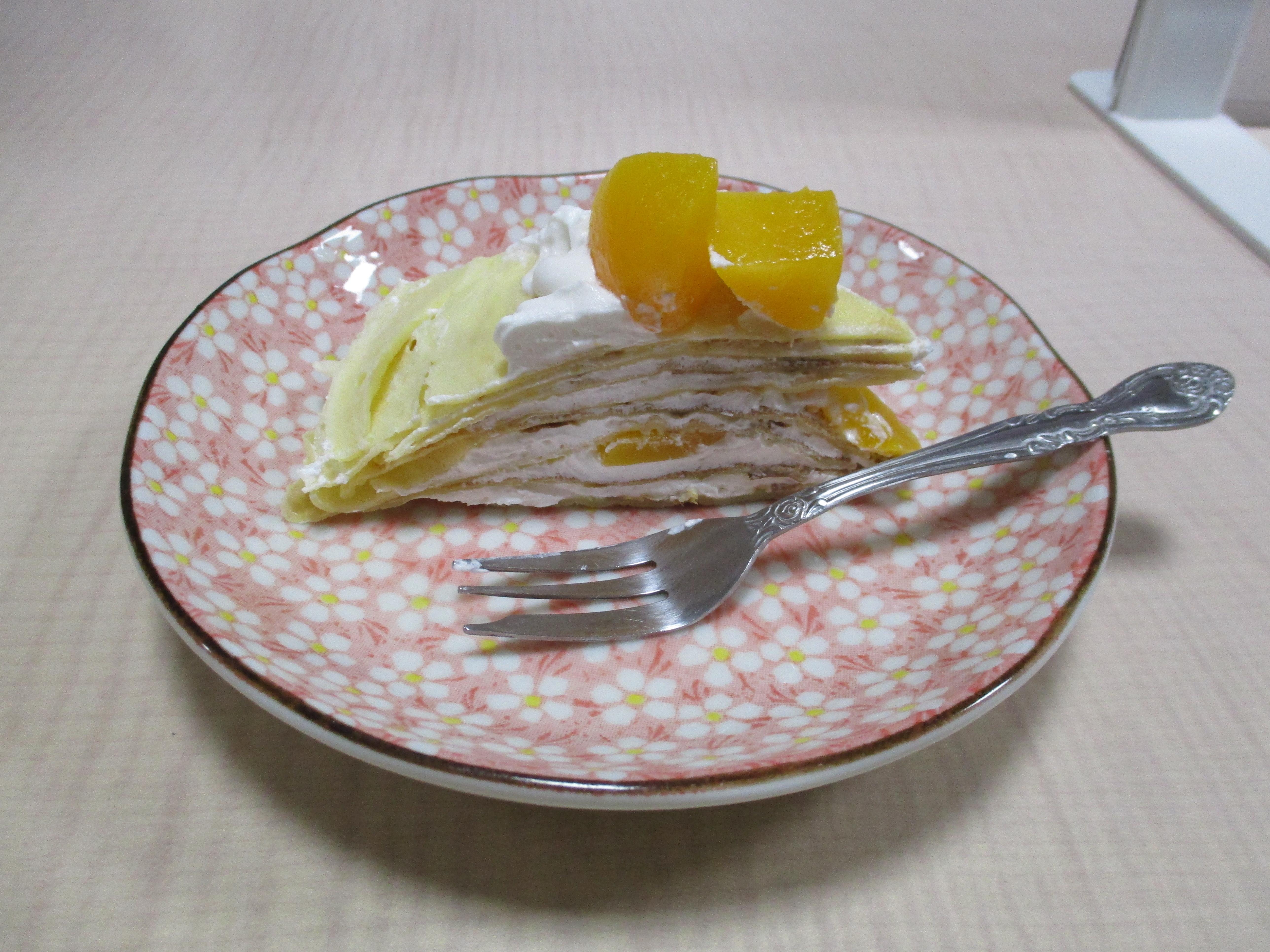 おやつレクリエーションでは、ミルクレープを作りました。何層も重ね、綺麗に出来上がりました。