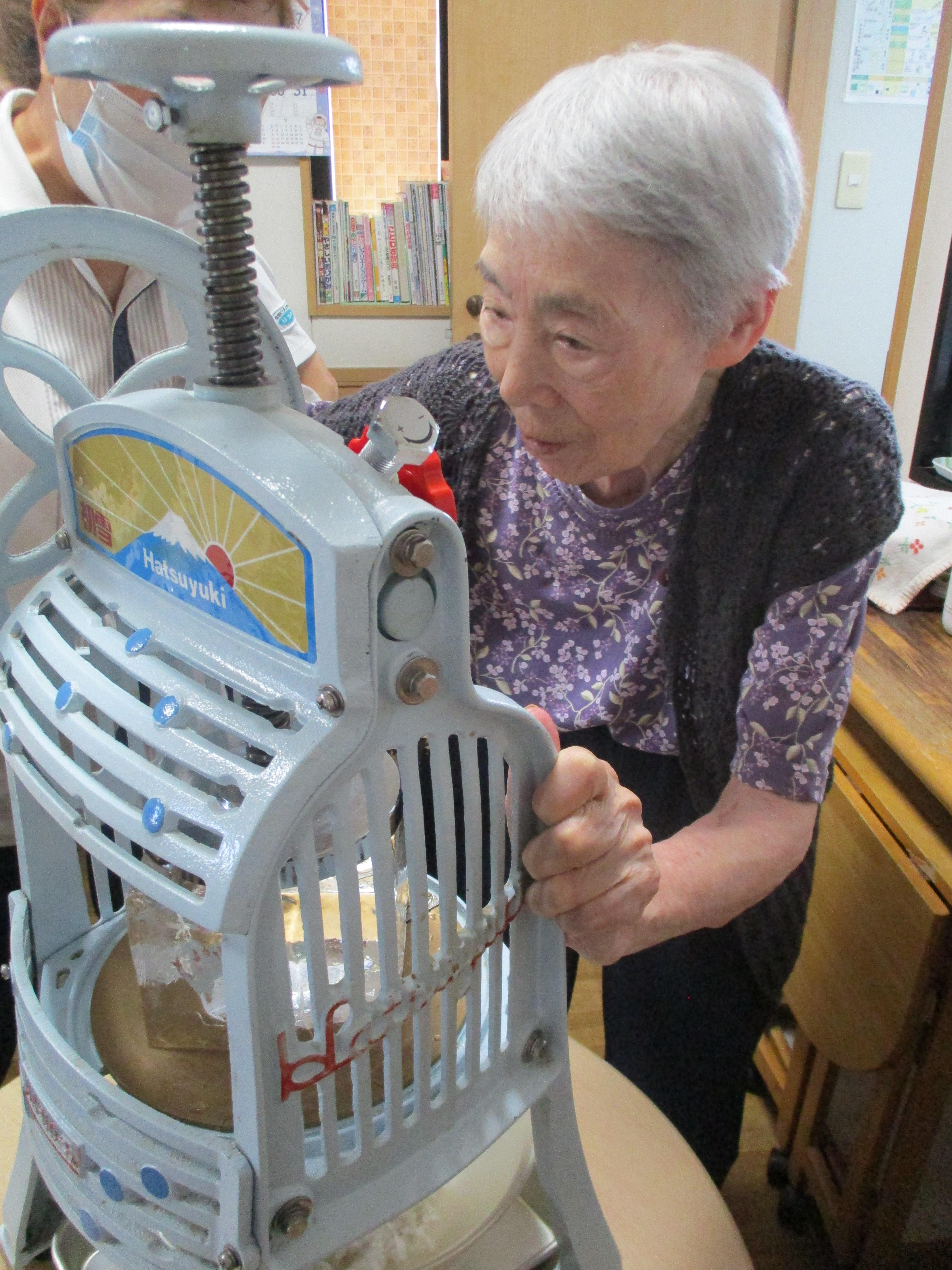 おやつレクリエーションでは、1階2階合同でかき氷をしました。