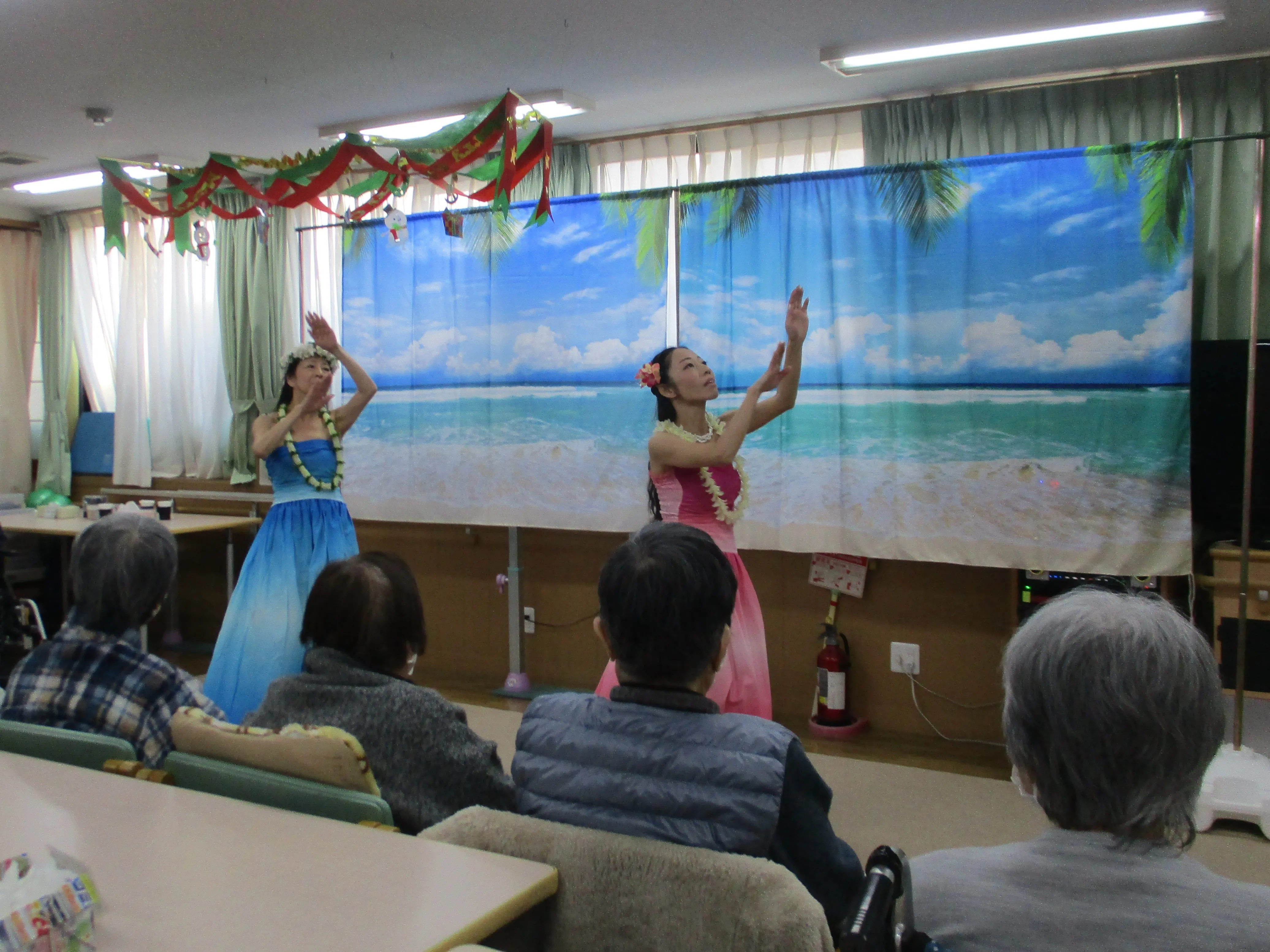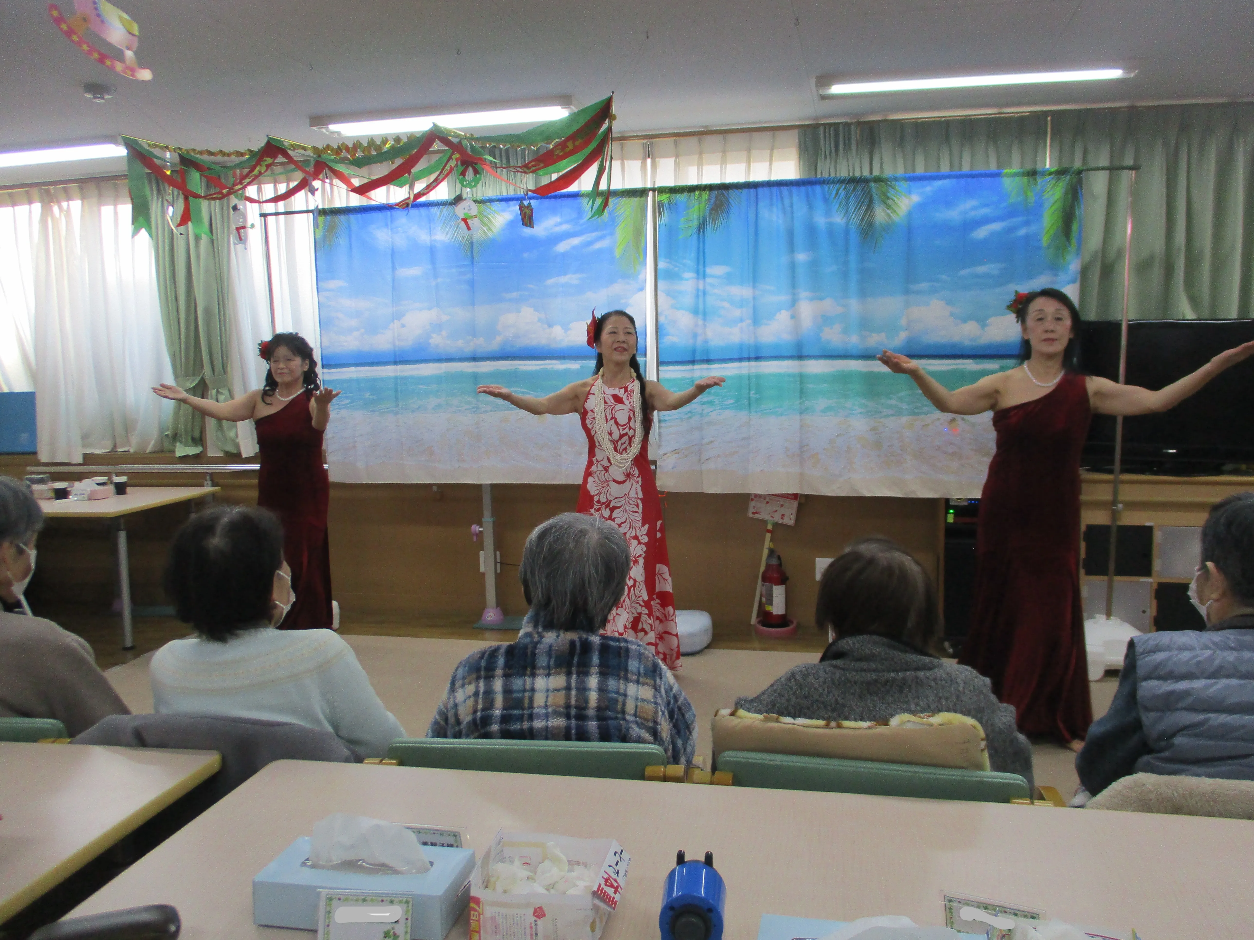 デイサービスの招待を受け、ボランティアフラダンスの「アロアロ」さんを見てきました。
