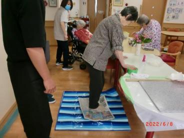 普段、足取りがゆっくりな方も、スタッフと一緒に力強く踏んでもみ込んでいただきました。