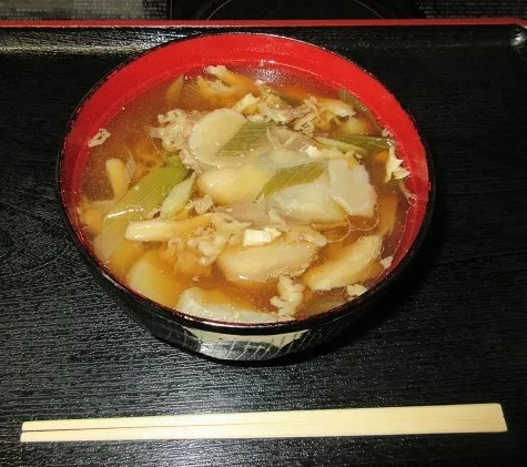 完成した芋煮は『山形風芋煮』具材は牛肉、里芋入りの醤油味。