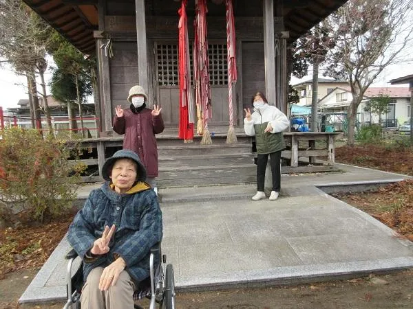 今年初めての外出レクとして、お客様と近所の神社へ初詣へ行ってまいりました。