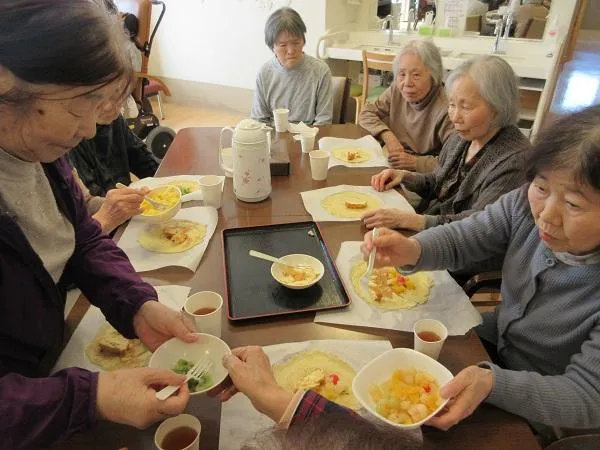 手作りクレープは、それぞれ思い思いに具をトッピングして頂き召し上がっていただきました。零れ落ちるクリームに、みなさま満足げな表情。