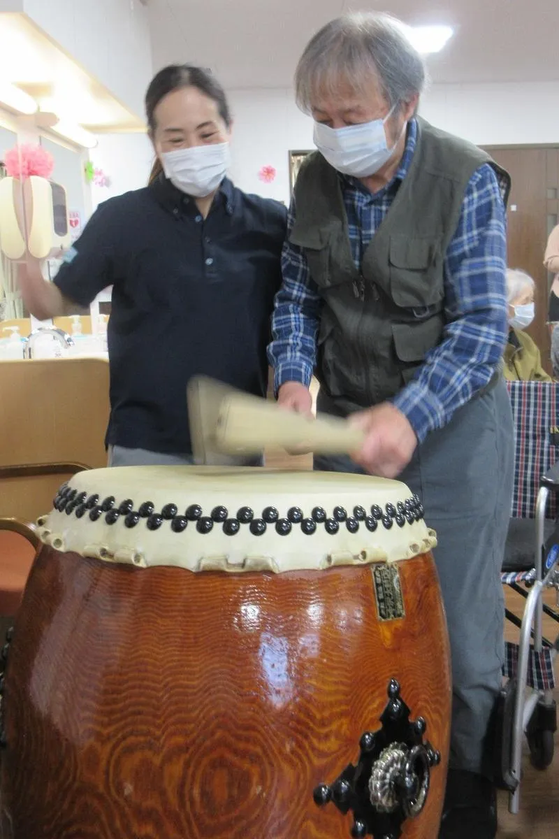 ところ変わって先日、お隣のツクイ仙台愛子のデイサービスにて、仙台育英獅子太鼓部の皆さまをお招きし迫力ある演奏を行って頂きました。