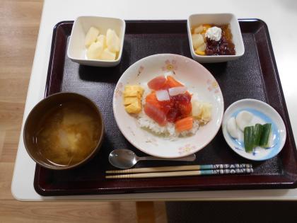 海鮮チラシ サラダ、みつ豆、リンゴ、浅漬け