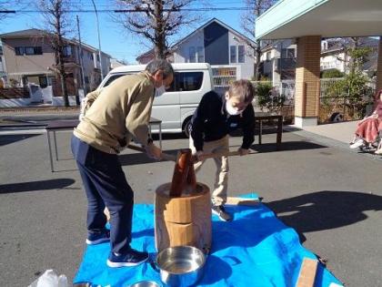 餅つきでは、お一人ずつ重い杵を持ち「よいしょ。ぺったんこ。」と体験して頂きました。
