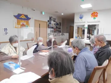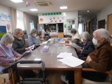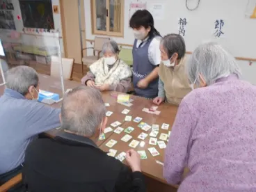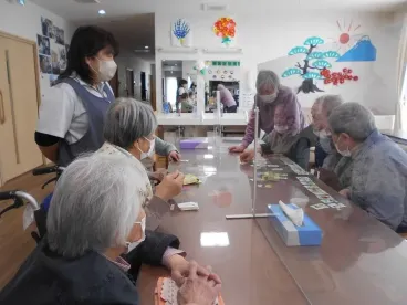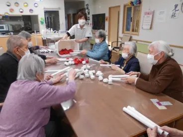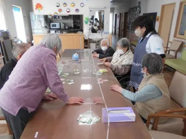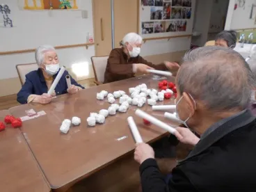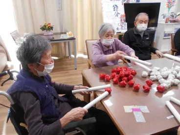 大寒波が到来し、真っ白な雪景色になりました。こんな時は暖かい所でかるたをしたり、歌を歌ったりするのが一番ですね。棒で小さな玉を落とさないように隣の方に渡す、ユニークな事も行いました。まだ厳しい冬ですが、春は必ず訪れます。節分でも悪い鬼を退治しました。皆様が無病息災でいられるよう、努めてまいります!