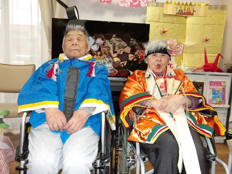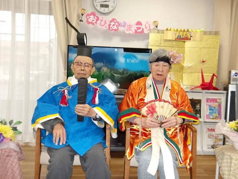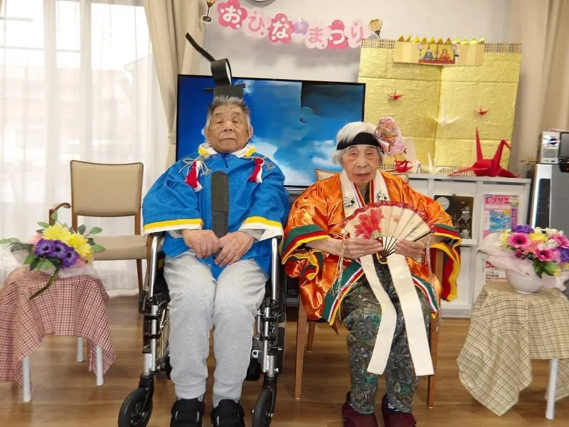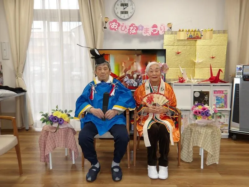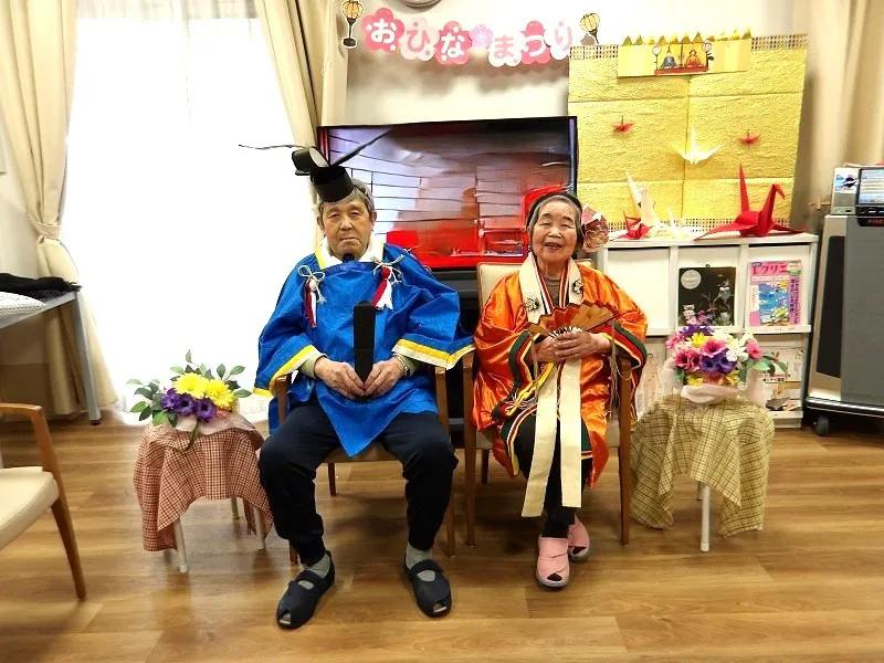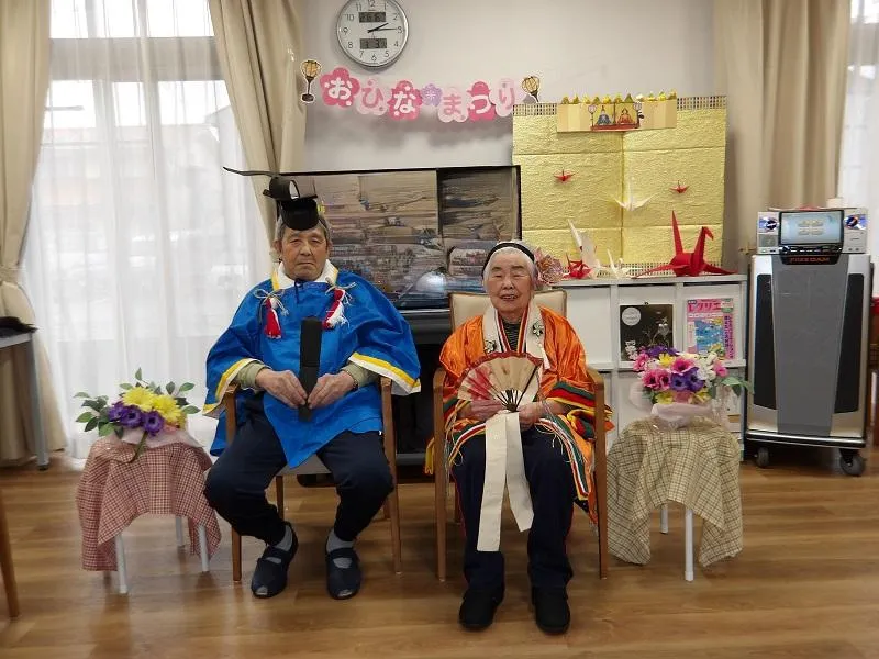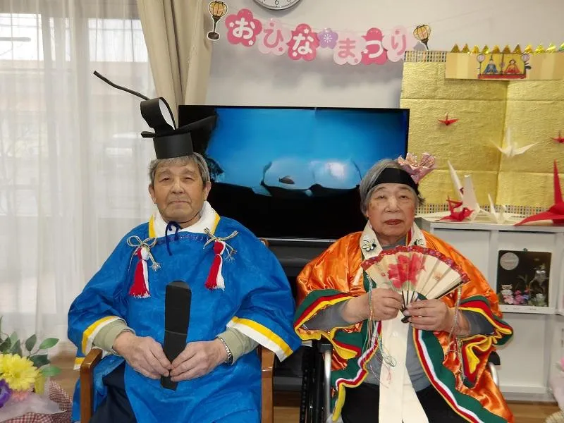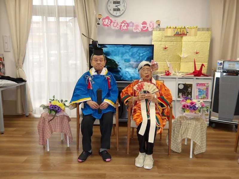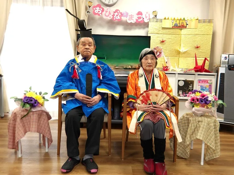 桃の節句を迎え、皆様にお内裏様とお雛様になっていただきました。口紅を塗り、身なりも整え、撮影に挑みました。やっぱり撮られると、緊張してしまいますよね。それでも皆様並んですまし顔、からの笑顔を見せてくださいました。