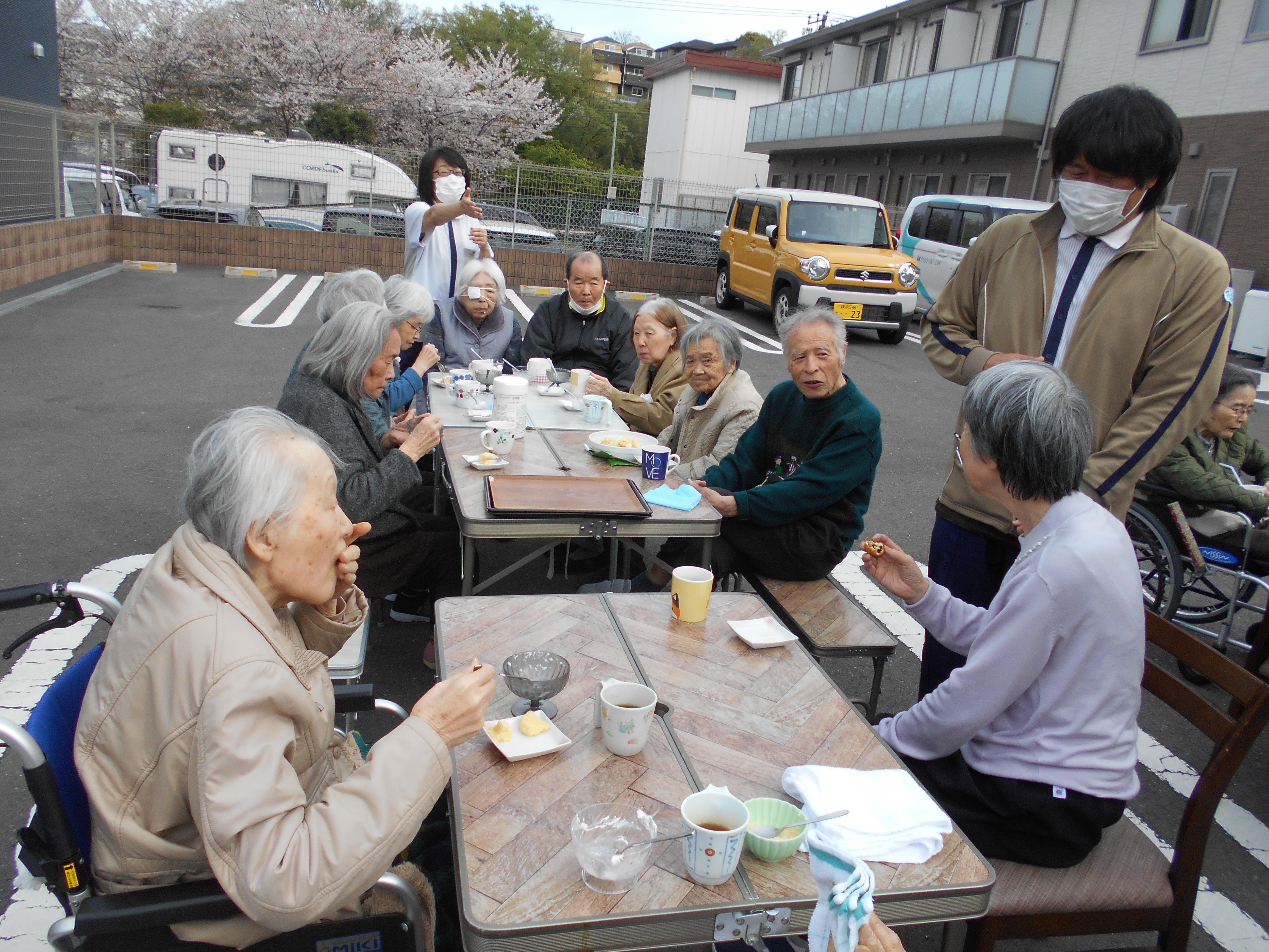 花見はほとんど桜は咲いていませんでしたが、第二弾はグループホームの駐車場で3時のお茶の時間を過ごしました。暖かいと思っていましたが、だんだんと肌寒くなりつつも、暖かい飲み物を飲んで皆さまと会話が弾むひと時でした。