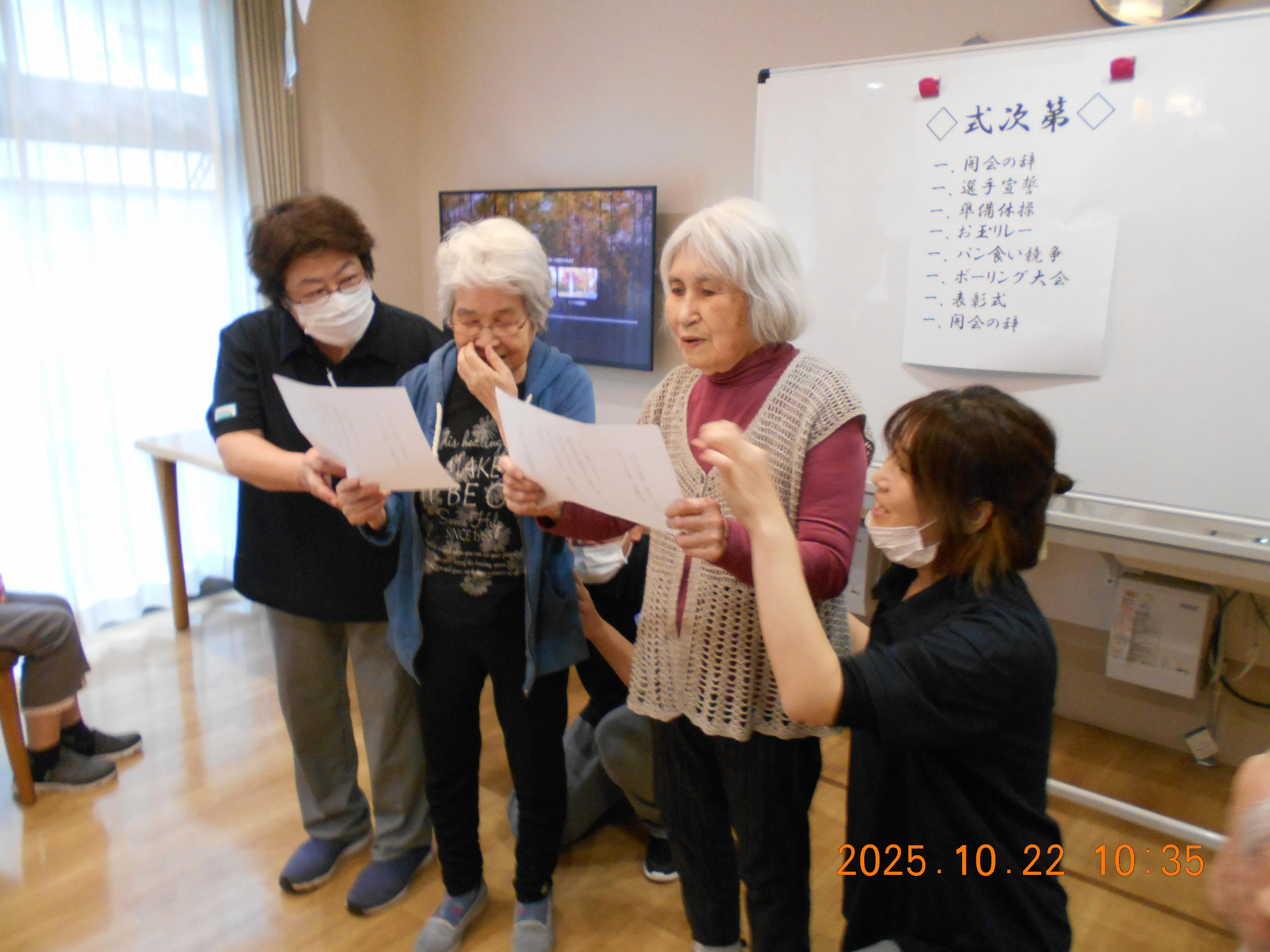 選手宣誓から始まり、運動会が始まります。ご高齢の運動会ということもあり、3種目で決着をつけます。結果は… 3-0で2階ユニットの勝利!