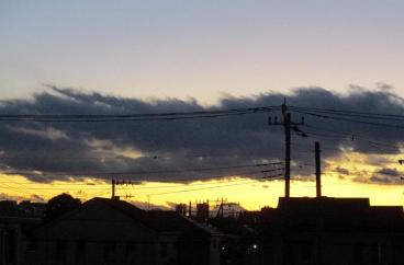 こちらは、夕方に2階のリビングから撮影した富士山の写真です。家や電線で見えづらいですが、よく目を凝らして見ると、中央付近にぼんやりと山のシルエットが見えます。お客様方は富士山が見えるとお喜びになり、ご一緒して山を眺め、こうして写真を撮ることもあります。