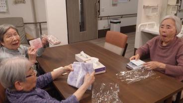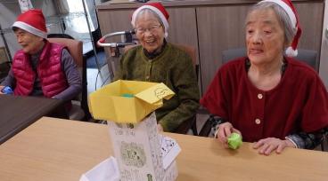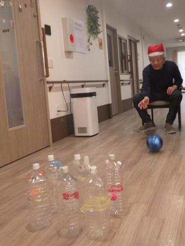 12月は25日にクリスマスがあるということで、14日にかなり早めのクリスマスイベントを開催しました。体調の良いお客様に1階にお集まりいただき、合同で玉入れとボーリングを楽しみました。