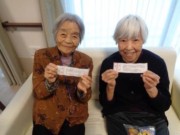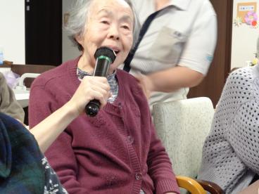お菓子が景品となるくじ引きから始め、景品の中には誰に当たるか分からない3枚のカラオケ券を入れていました。どなたに当たるか楽しみにしていましたが、なんと1番目と2番目に引いたお客様に早々とカラオケ券が入った景品が当たり、場が一気に盛り上がりました。照れながらスタッフに代わりに歌ってもらうお客様もいれば、スタッフと一緒に笑顔で歌われるお客様、カラオケ券が当たらなかったお客様も口ずさみながら参加されていました。
