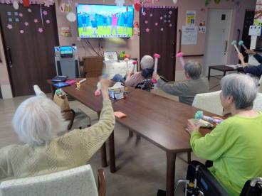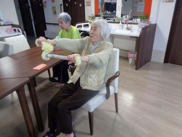 普段からテレビ体操を行うのですが、その際に使用する棒をお客様と一緒に作ってみました。なんと、この棒はサランラップの芯を再利用し作っています。ぺーパーフラワーが体操で動かすたびに揺れてとても綺麗です。お客様にも「色がきれいだね~」等と好評でした。