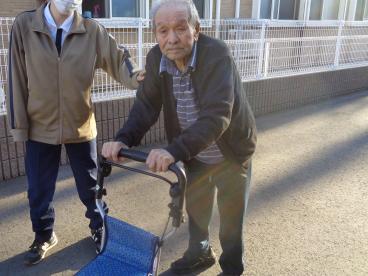 こちらは散歩での様子です。久しぶりの散歩に、最初は行くのを遠慮していたお客様でしたが、一度歩いてみると「週1回でも散歩しないとな~」とのお声がありました。普段より少し長めの歩行でしたが頑張って歩かれていました。外の風を浴びる事で少し気分転換になった様子でした。