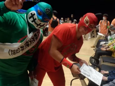昔から柔道をされていた男性のお客様は、終始真剣に観戦されていました。最後にはプロレスの選手の方からサインをいただき、良い表情をしてました。今回の外出で気分転換が図れて良かったです。