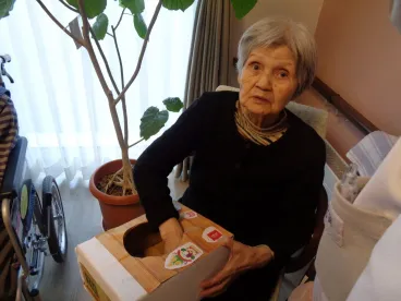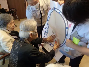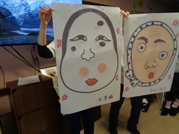 最初は、目隠しをして福笑いに挑戦しました!スタッフの手助けを受けながら、一人1パーツずつ「ここかな~」と悩みながら貼っていました。完成した顔を見ると、変な場所に眉がきていたり、左右の目の高さがずれていたりと、ちょっとおかしく大笑い。ですが、ちゃんとおかめとひょっとこの顔が完成しました。