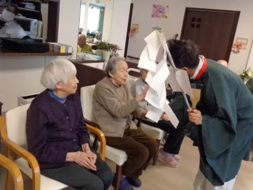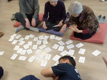 選抜かるた大会では、各ユニットお客様3名vsスタッフの対戦でした。何枚もあるかるたの中から見つけるのが難しく、苦戦しまくりなスタッフでしたが、お客様の機敏な動きにびっくり。輝も月光もどちらもお客様が勝ち、スタッフは惨敗の結果に終わりました。またいつかリベンジしたいです!