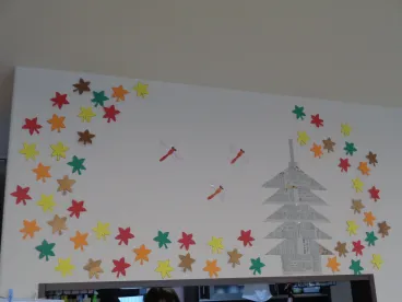 壁には、紅葉と五重塔の景色をモチーフにした壁飾りを作成しました!