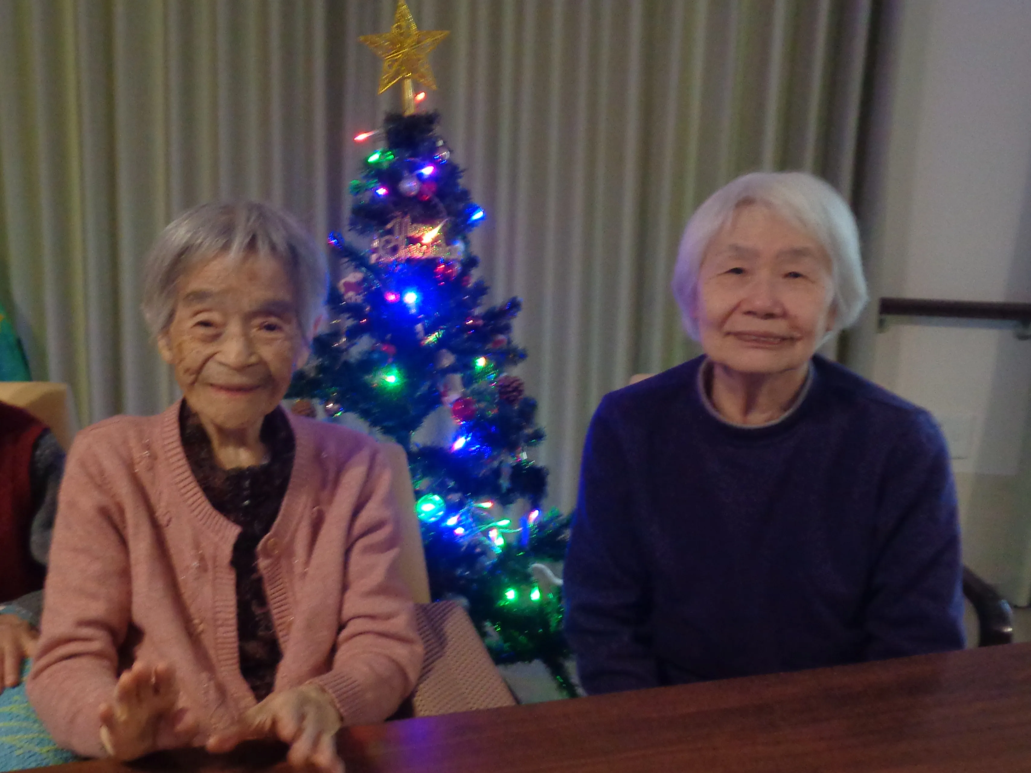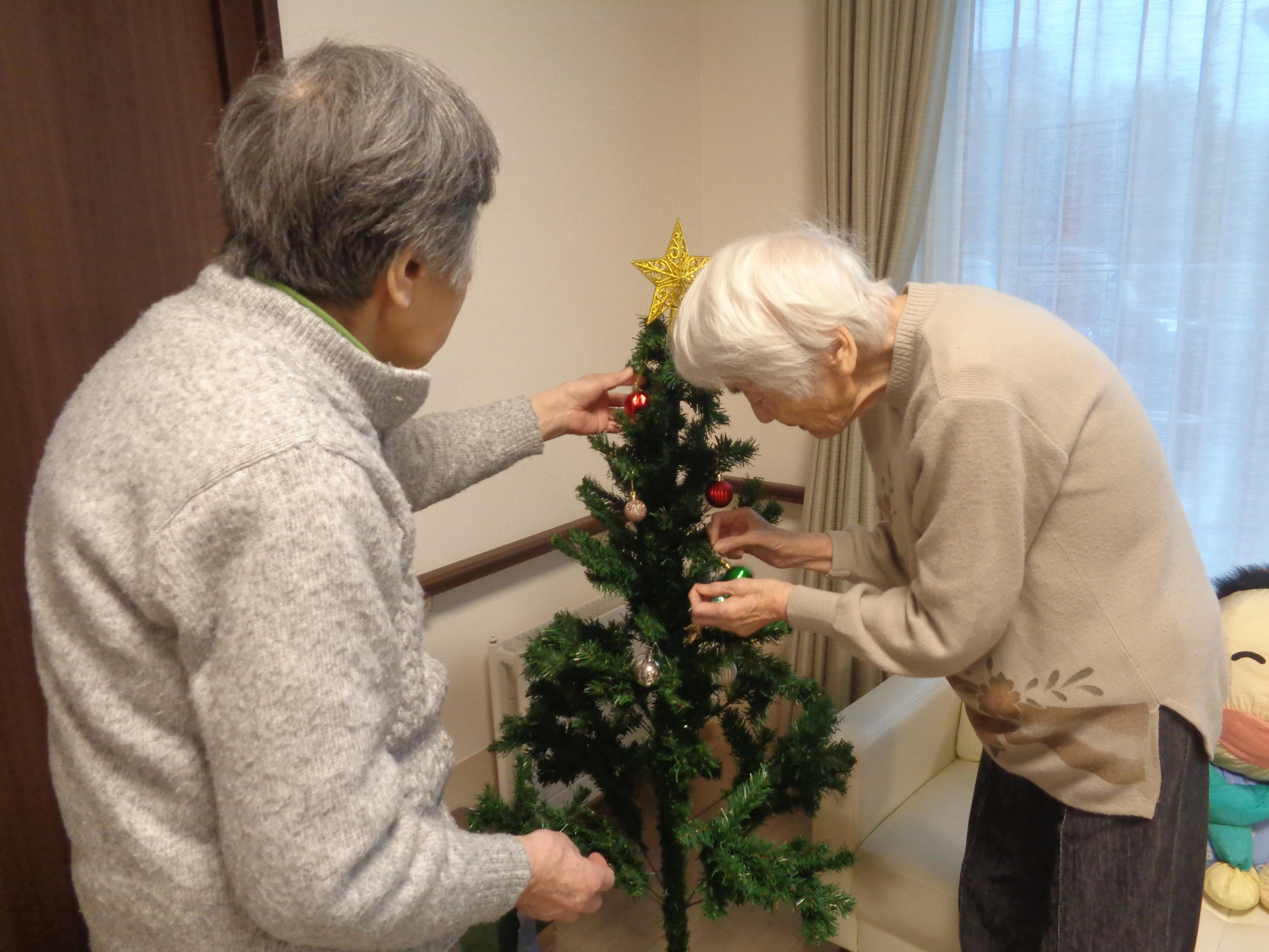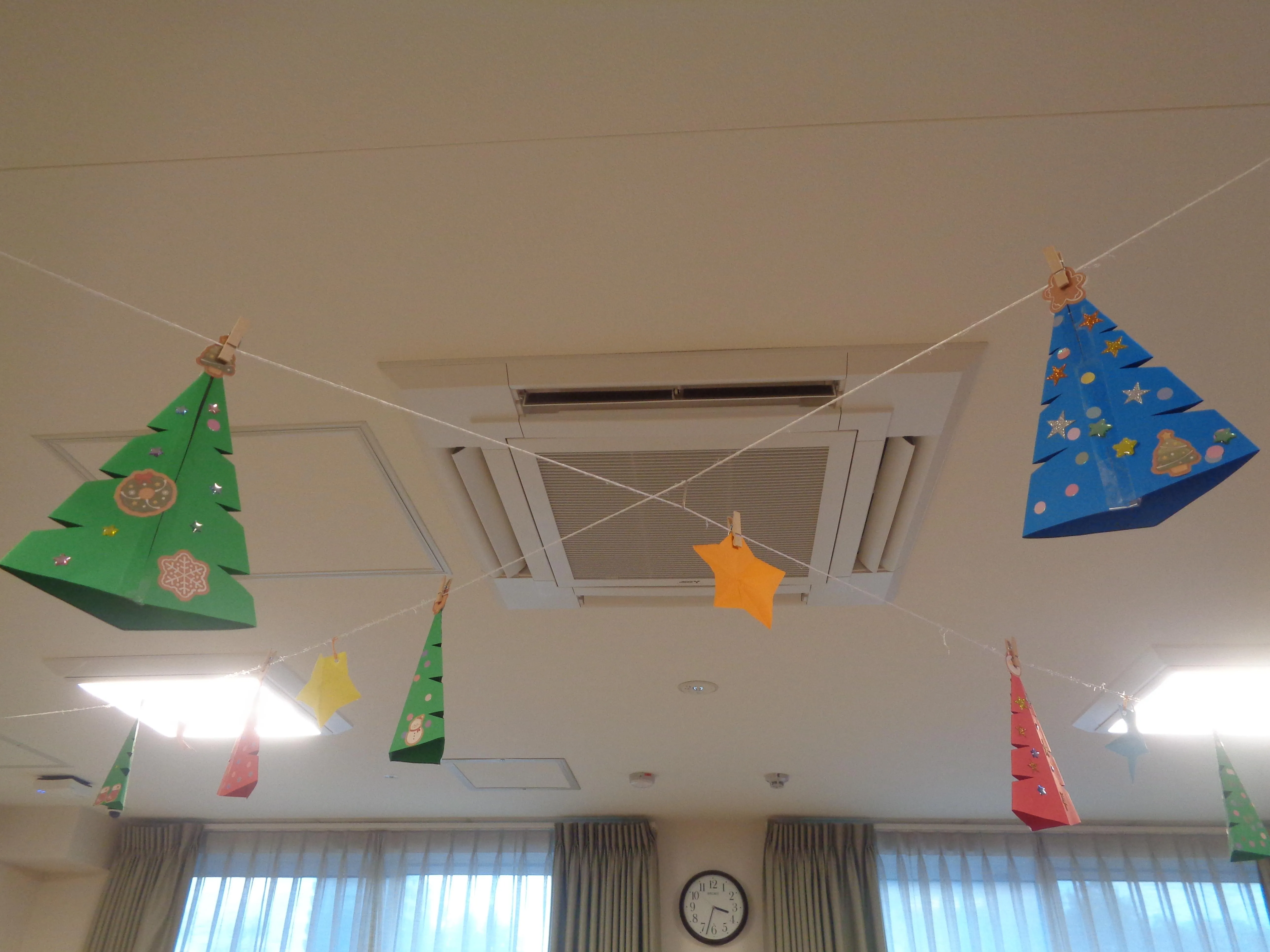 グループホームではクリスマスにちなんだ壁飾りや吊るし飾り、クリスマスツリーをお客様にお手伝い頂き、飾っています。