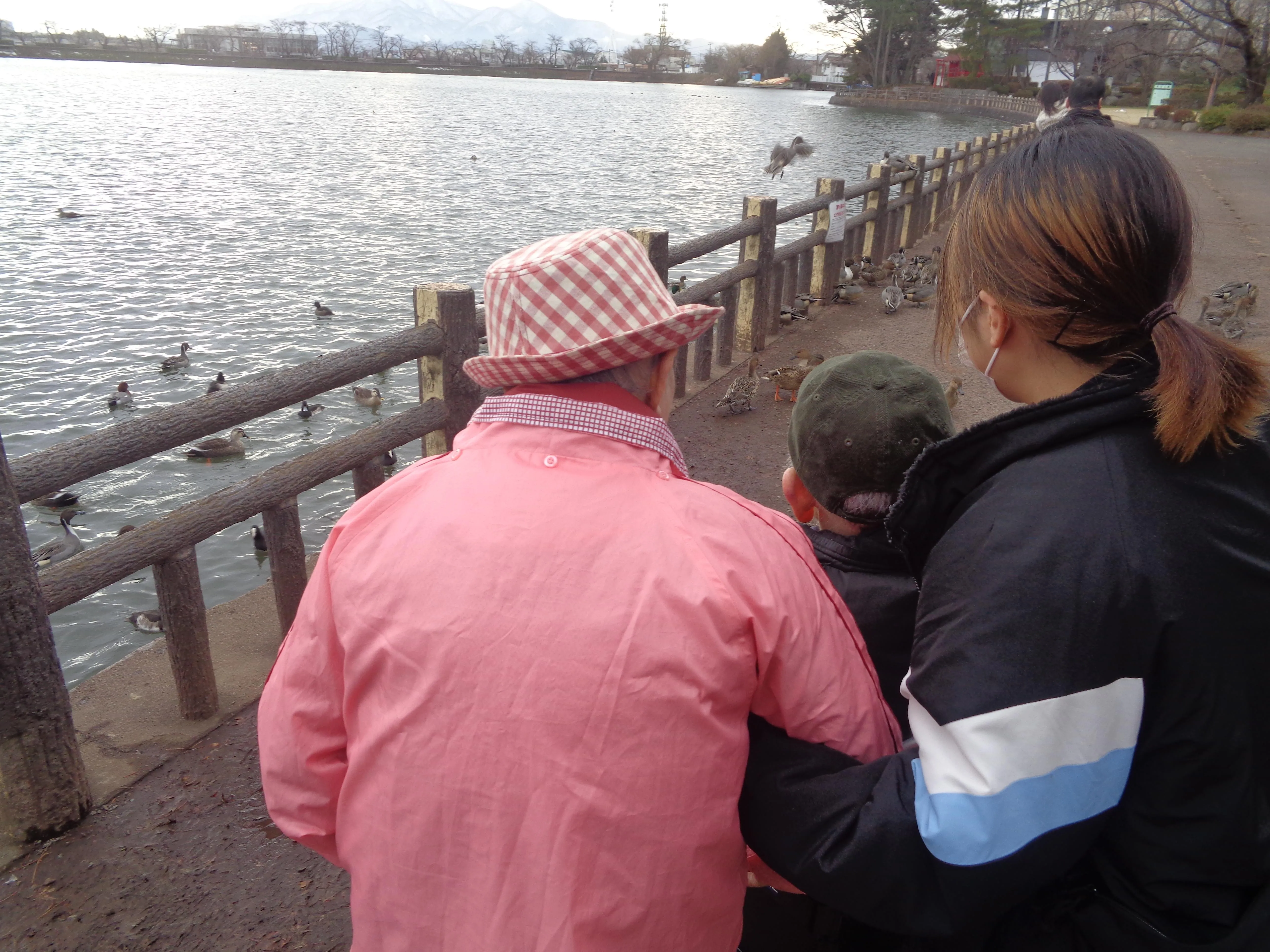 また、偶然ツクイ盛岡のスタッフの方が、お子さんを連れて来ており、そのお子さんがカモに食パンをあげている様子を見ることができました。カモが大勢集まる様子は迫力があり、近くで見学することができました。