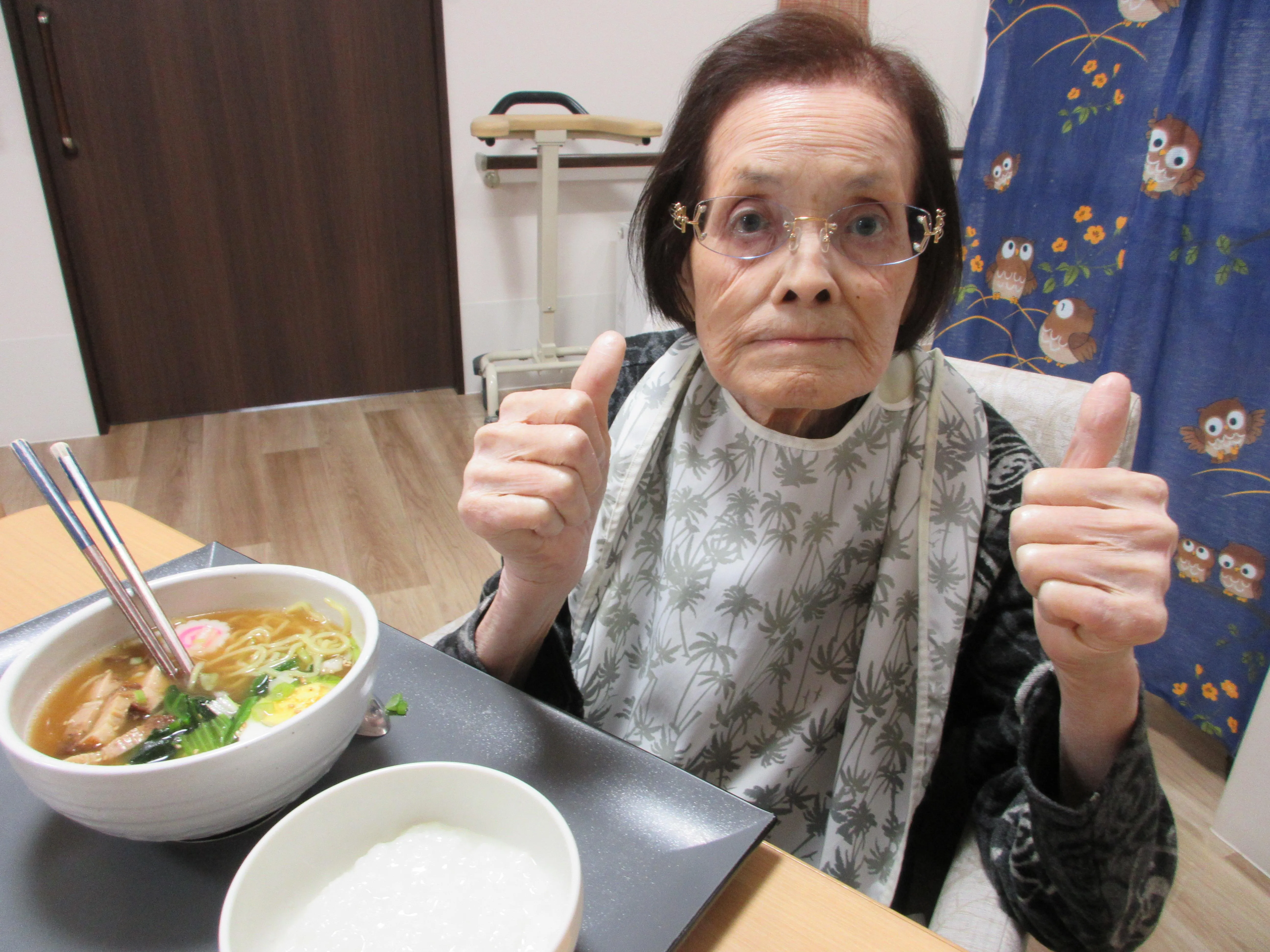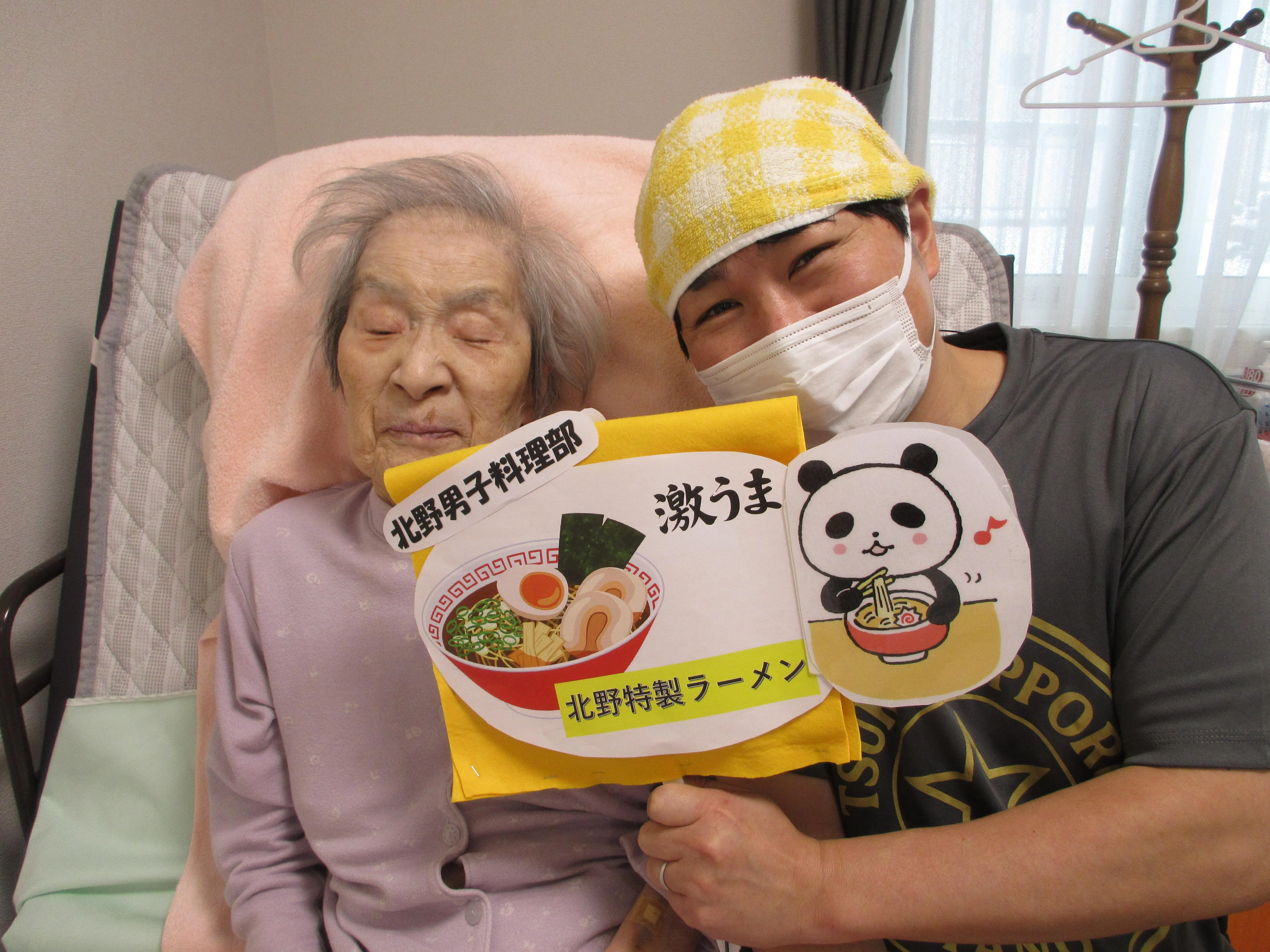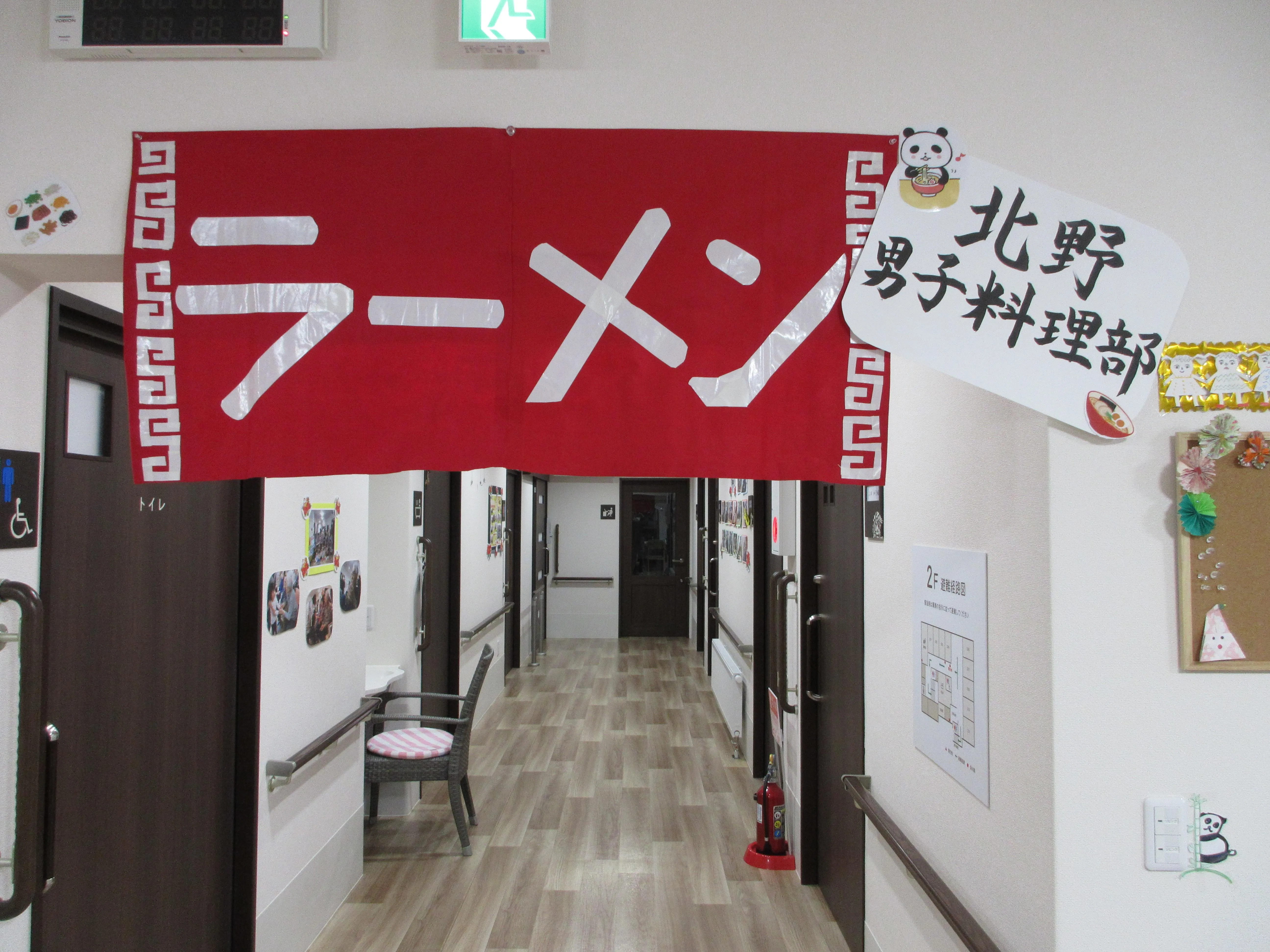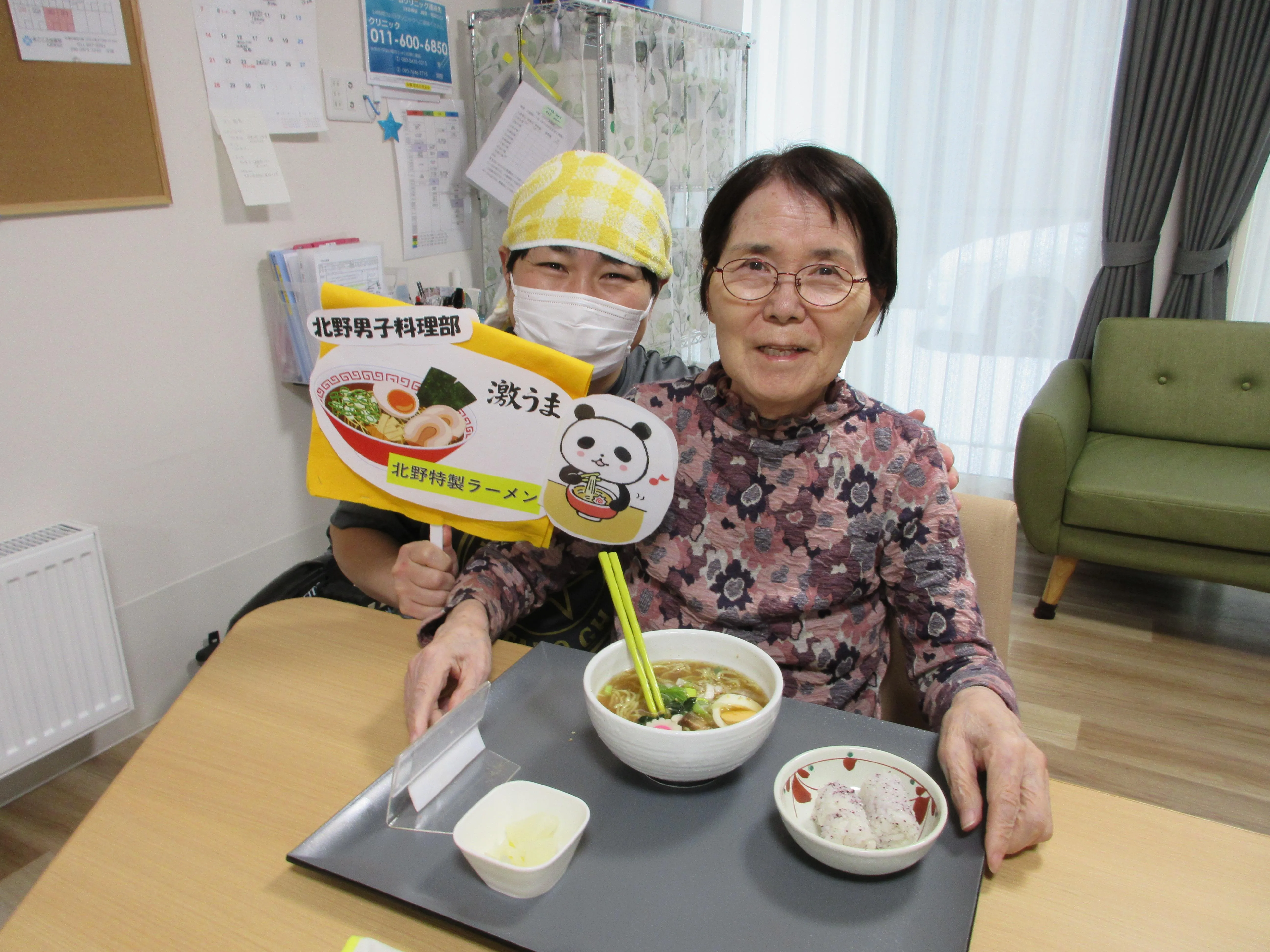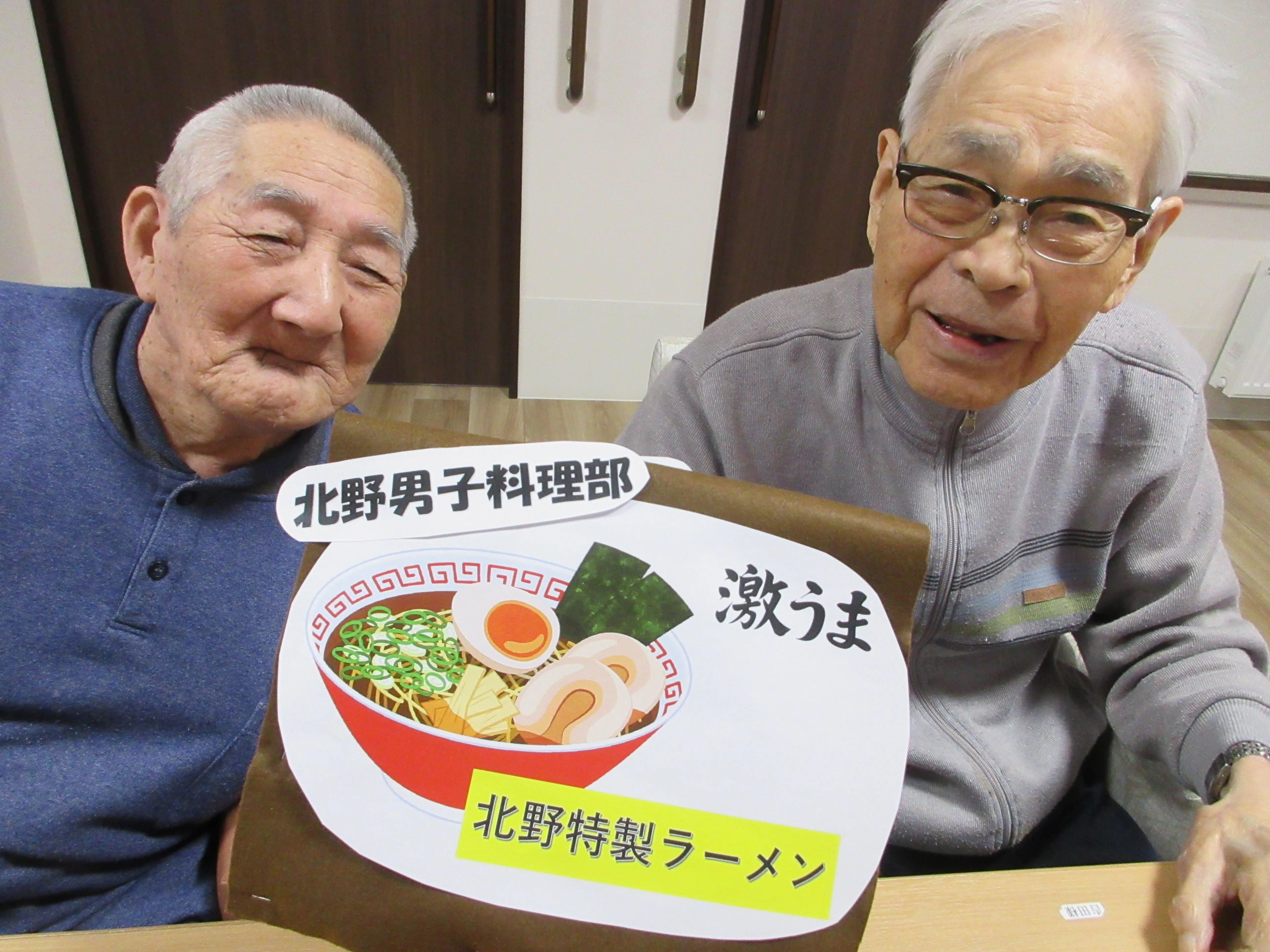 今月は「北野男子料理部」と題し、管理者と介護スタッフの2名で手作りラーメンを作りました