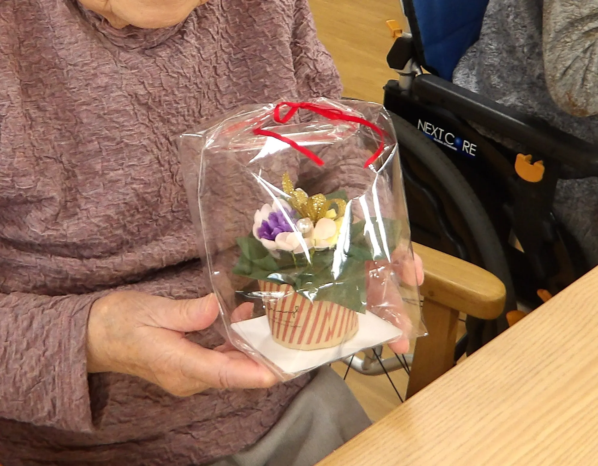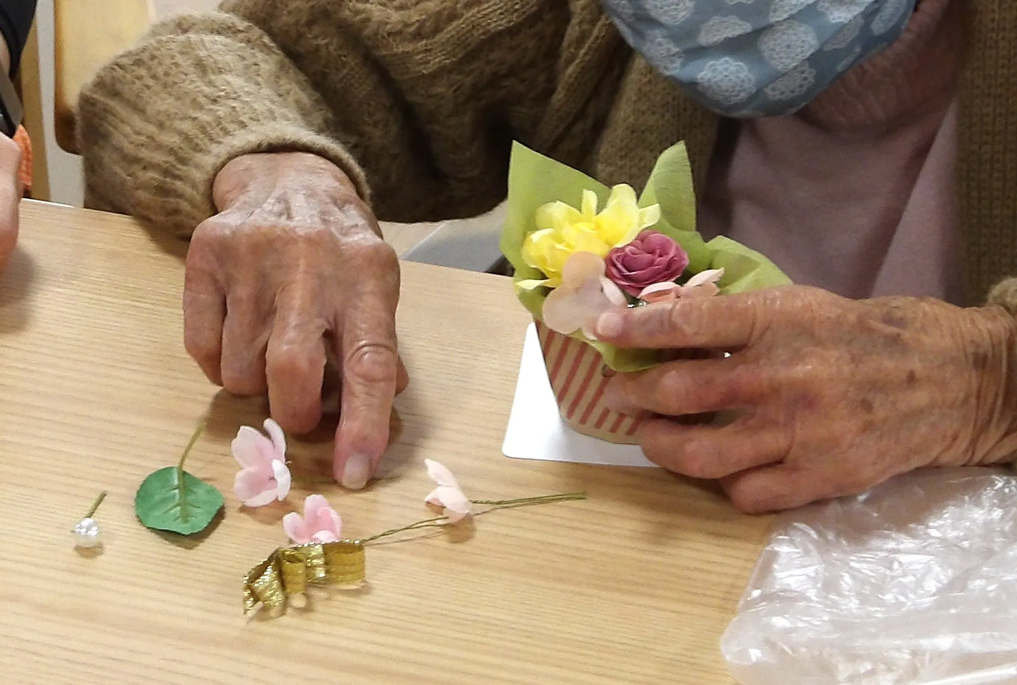 ツクイ焼津では、持って帰れる(飾れる)作業に取り組んでおります。今回は、造花フラワーアレンジメントです。皆さま、細かい作業でも真剣に取り組まれ、素敵なお花が完成しました。
