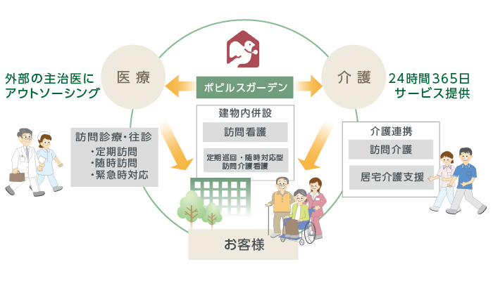 ツクイのホスピスは、病院での終末期看護の機能を外部の主治医にアウトソーシングすることで、高度な看護ケアに注力した在宅型の医療が提供できる施設です。