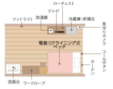 居室は全室個室で、生活に必要なベッドや寝具、家具、家電をご用意していますので、最低限のお荷物でポピルスガーデンでの生活を始めていただけます。お気に入りの大切なものなど、心安らぐ品をお持ち込みいただき、もうひとつのご自宅のようにおくつろぎください。