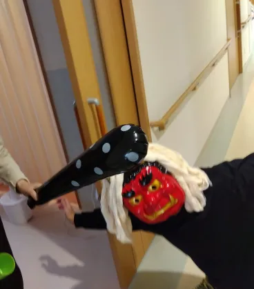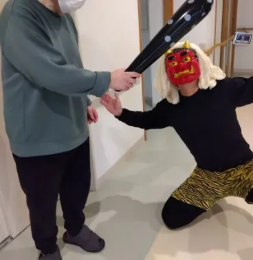 2月3日、ツクイ・サンフォレスト新潟山潟にも鬼がやってきました。各お部屋を訪問した鬼を、皆様容赦なく退治!