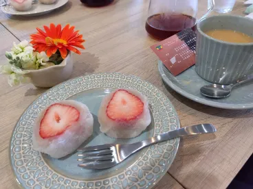今年はお天気が悪い日が続き、なかなか桜を見に行くことができなかったのですが、4月12日、ようやくお出かけをすることができました。皆さんの大好きな菜菓亭さんのカフェ、『米希舎(まいきや)』さんのスイーツを食べに行ってきました。大福の中に大きないちごが入っていて、おいしいコーヒーとともに大満足!帰りにスポーツ公園の桜を見ながら、お散歩をしてきました。