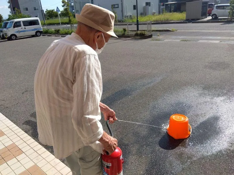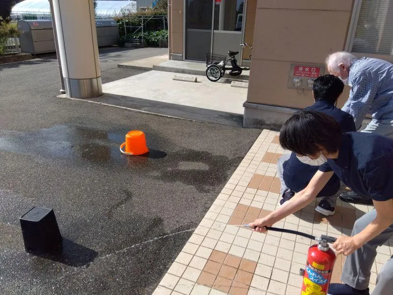 9月16日、厨房からの火災を想定した避難訓練を行いました。今回は火災発生からお客様への周知、避難する際の注意事項を確認しました。また、スタッフとお客様で消火器の使用訓練を行いました。このほか当施設では、お客様に安心してお過ごしいただけるように、感染症や自然災害時の訓練や研修を定期的に行っています。