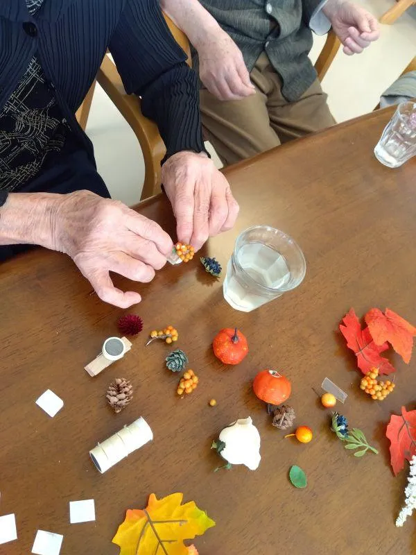 9月24日、毎月恒例の茶話会を行いました。先月新たにご入居いただいたお客様も参加され、笑い声が絶えない会となりました。今回はお花や秋のモチーフを使って、素敵なマグネットを作りました。クリップでメモを挟めるようになっているので、「医者の予約メモを挟むのにいいね」など様々な活用アイデアのお話しも弾みました。