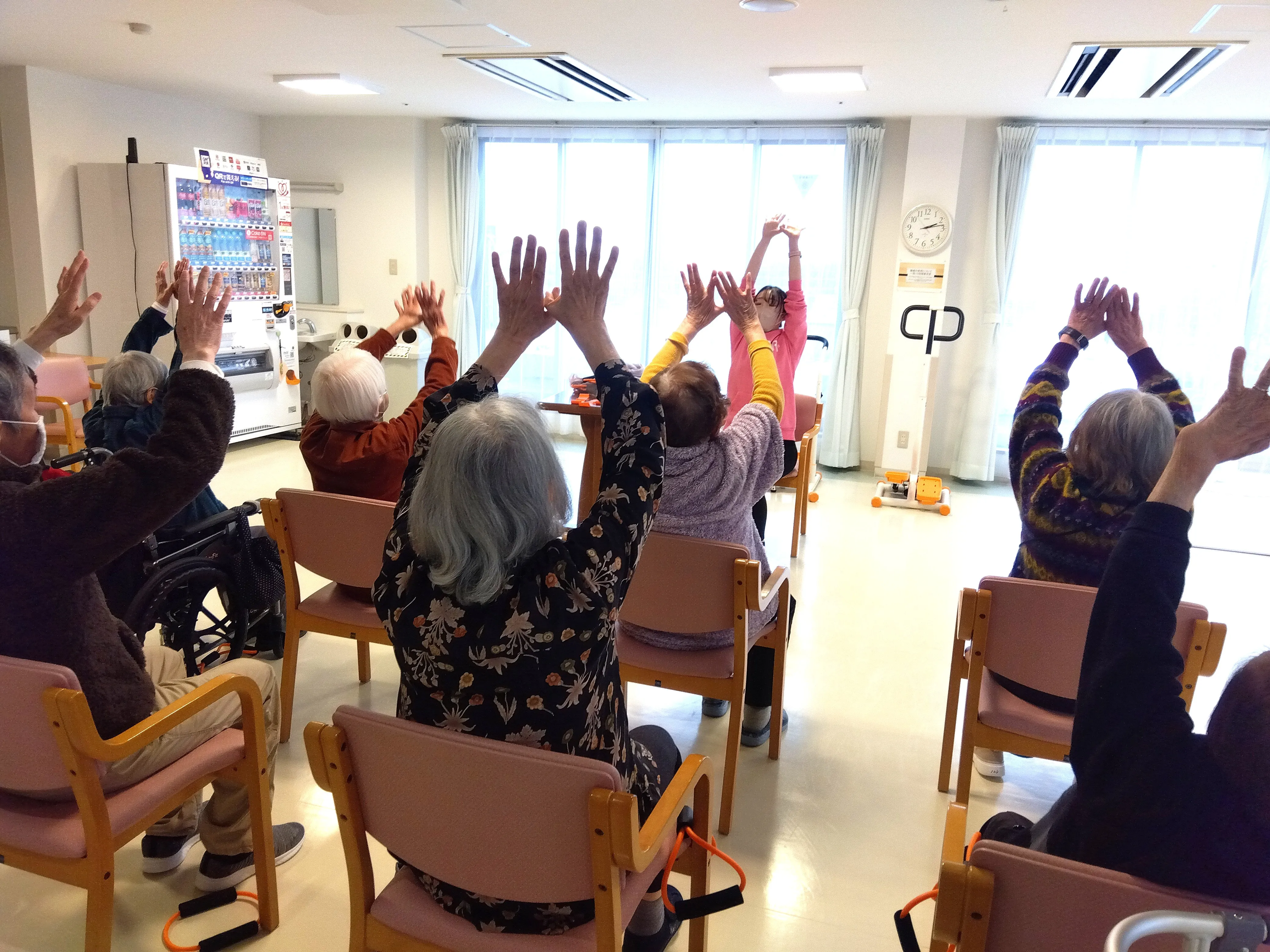 元気に冬を乗り越えられるように、とっても素敵なAYA先生より、ストレッチと筋力アップ体操を指導いただいています。体操の後は身体はぽかぽか、お客様の表情も生き生き!