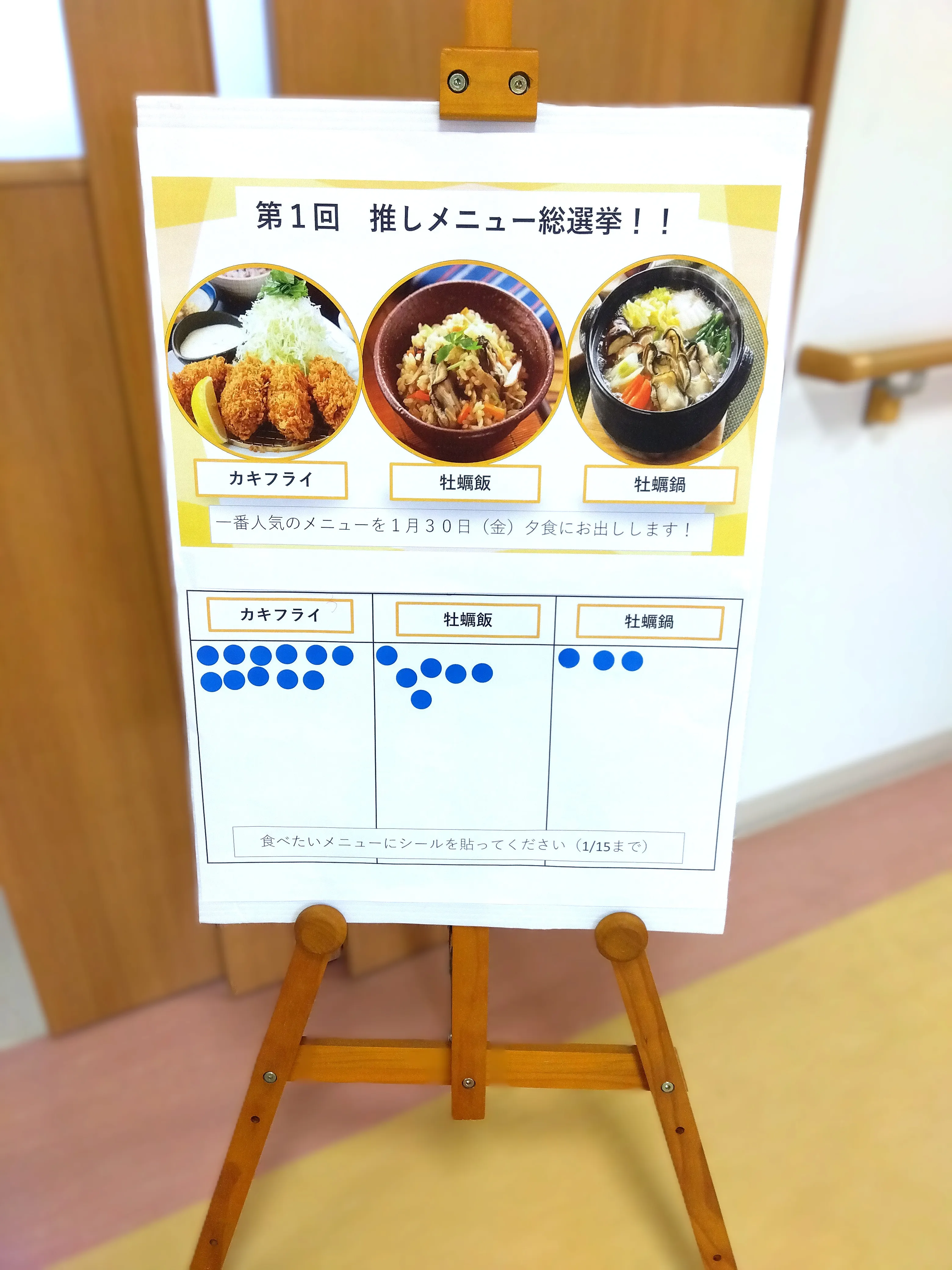 「カキフライ」「牡蠣鍋」「牡蠣飯」の3つから選んでいただきました。ご入居のお客様はもちろん、ご家族、面会の方などにも参加いただき、『カキフライ』に決定!30日の夕食に召し上がっていただきました。2月の総選挙は「カニ」です。お楽しみに!