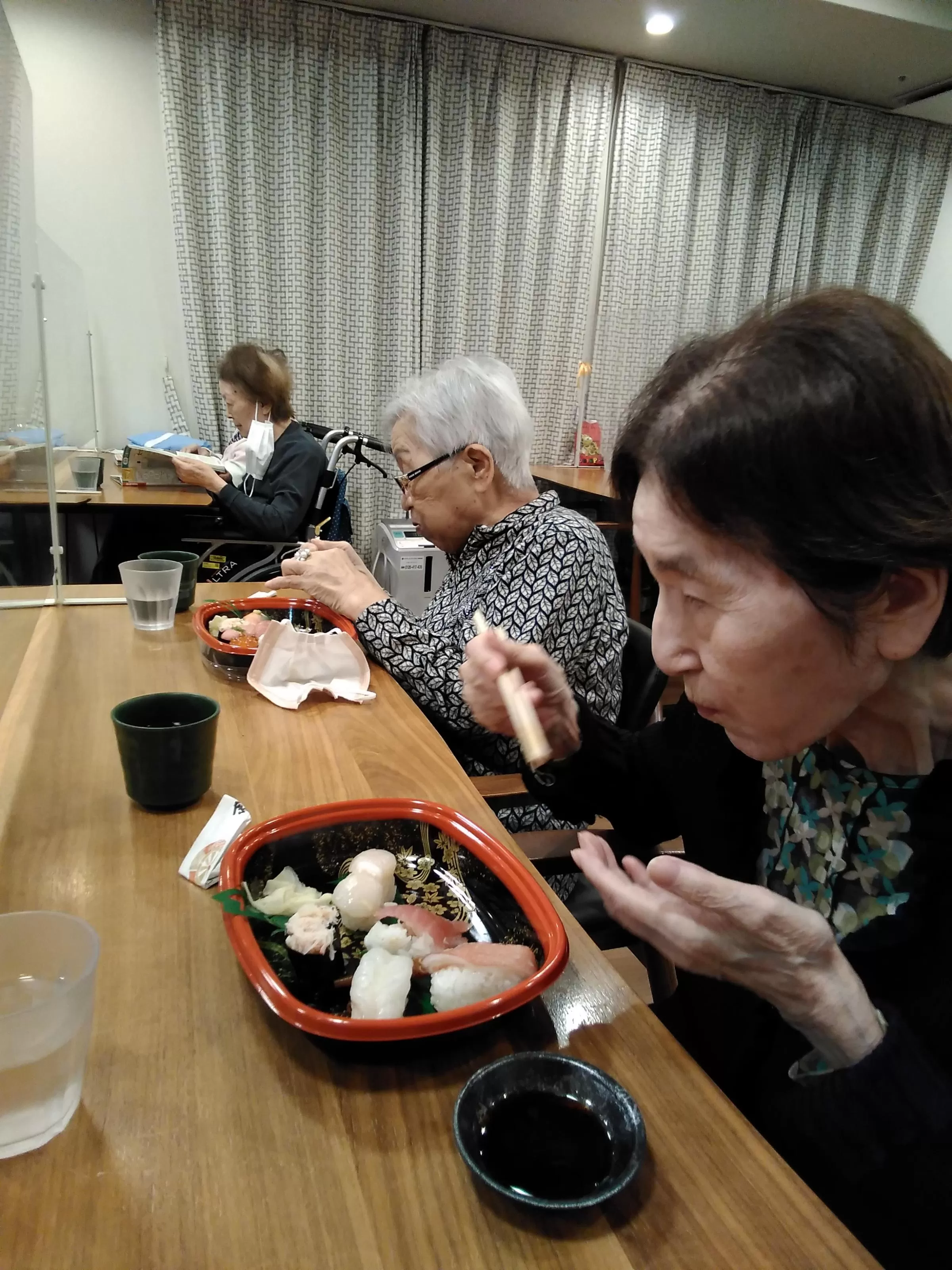 毎日おいしい食事を厨房で提供していますが、「たまには宅配のお寿司も食べたいな」ということで、希望者で宅配寿司を堪能しました。
