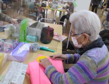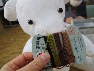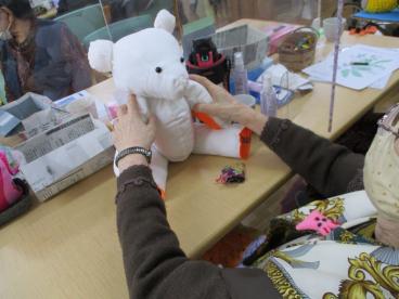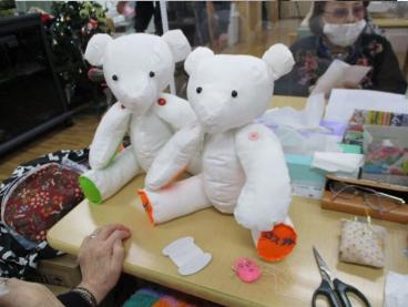 裁縫が得意なお客様と相談した結果、ツクイ小菅ヶ谷ではペアのクマ人形を作ることに決めました。布を切って縫い合わせ、手や体には綿を詰めると、段々とクマの形になってきます。