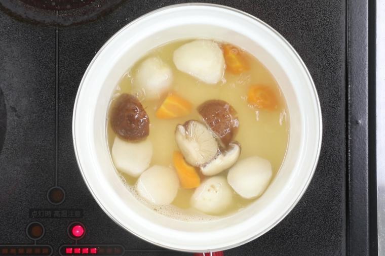 ④ 鍋に ★を入れ煮立たせ、にんじん・下茹でした里芋・干ししいたけを入れやわらかくなるまで煮る。