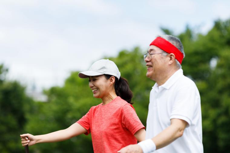 ノルディックウォークは関節や骨への負担が軽減されるため、疲労感を感じにくいといわれています。しかし、体が慣れていない状態で長時間歩くことにより、誤った姿勢が身についてしまったり、局所的な痛みが出現してしまうこともあります。準備運動をしっかりと行い、はじめは5分程度から徐々に距離と時間を延ばしていきましょう。歩行の速度は、軽く息が弾むくらいの負荷で、隣の方と会話が楽しめる程度の速さを維持しながら行います。頑張りすぎず無理なく行うことが継続のカギとなります。