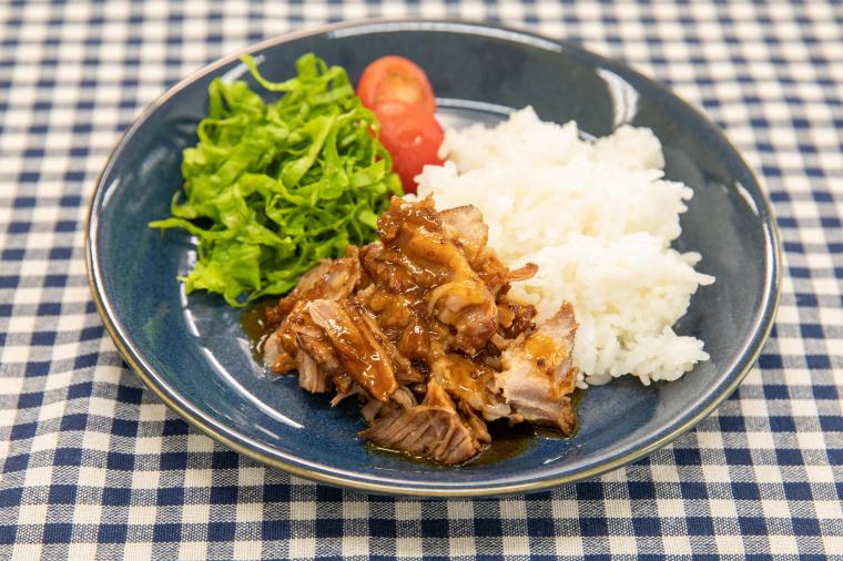 スペアリブは食べやすい大きさにほぐしてお皿に盛りましょう。ミニトマトは湯むきすると食べやすくなります。ご飯も添えてワンプレートでどうぞ。