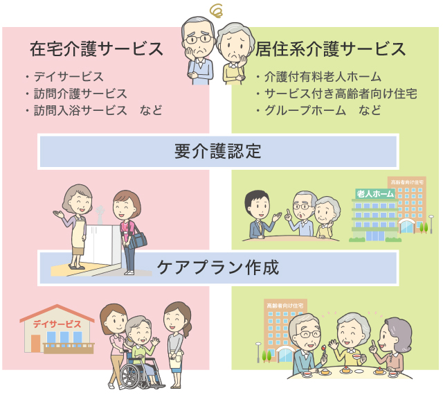 「要支援1・2」と認定された人は、地域包括支援センターで、「要介護1以上」と認定された人は、ケアマネジャーのいる居宅介護支援事業所(ケアプラン作成事業者)でケアプランの作成を依頼します。
