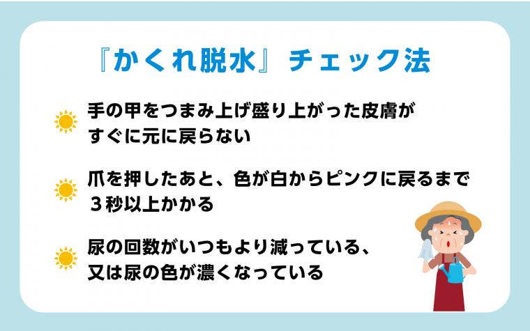 脱水症になると、体にどのような変化が現れるのでしょうか。簡単にできる『かくれ脱水』のチェック方法をご紹介します。