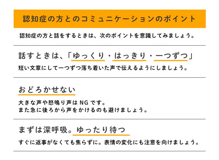 ご本人を支えるご家族など周囲の方が、ご本人の状態を理解して自尊心や尊厳を大切にすること。失敗や喪失体験に触れることは避け、ご本人が出来ることや楽しめることに焦点を当てること。説得や指導ではなく感謝の気持ちを伝えるなど、ご家族や周囲の方が「忘れたって、出来なくたって大丈夫!」と心の余裕と安心感をもつことがとても重要です。