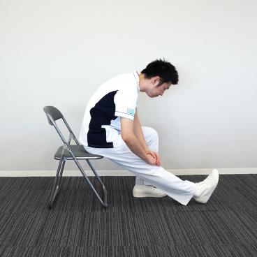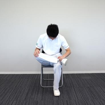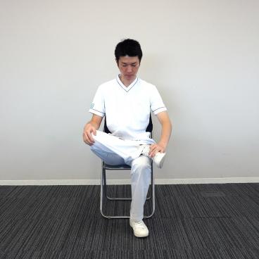 ① 椅子に浅く座って、右足を左太ももの上にのせます。