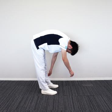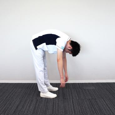 ① 足を肩幅にひろげて立ち、床に手を伸ばすように身体を前に倒します。
