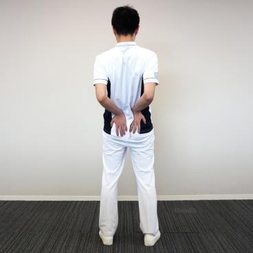 ① 足を肩幅にひろげてまっすぐ立ち、アゴをひいて腰に手を当てます。